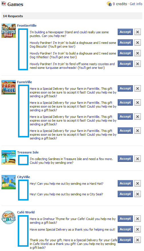 This problem is not specific to Frontierville either. As an example, Zynga's Cafe World game almost exclusively uses direct requests to obtain items as one part of progression. Most missions require cooking a specific dish a certain amount of times along with items obtained from friends. In most cases, the cooking can be done in a matter of hours or a day, while collecting the items could take several days if you have few friends that also play. At present for me, Cafe World requires 210 items obtained from direct requests to complete various missions and upgrade cooking equipment. With 4 active friends that play, that will take me 53 days to complete.