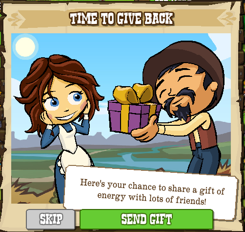 This game mechanism is a constant reminder that you "need more friends" to play the same game, so that you may advance. In addition, Zynga ensures there are additional reminders that you should add friends, delivered several times a game session. Some are harmless, a simple in-game popup asking you to send items to your friends. However, when the list of Facebook friends comes up, it defaults to your full list of friends or a list of 'recommended friends', rather than the third tab containing 'Frontierville friends' (the people you already know play). Other reminders to add friends are incredibly deceptive, challenging the idea that Zynga is a company based on integrity.
