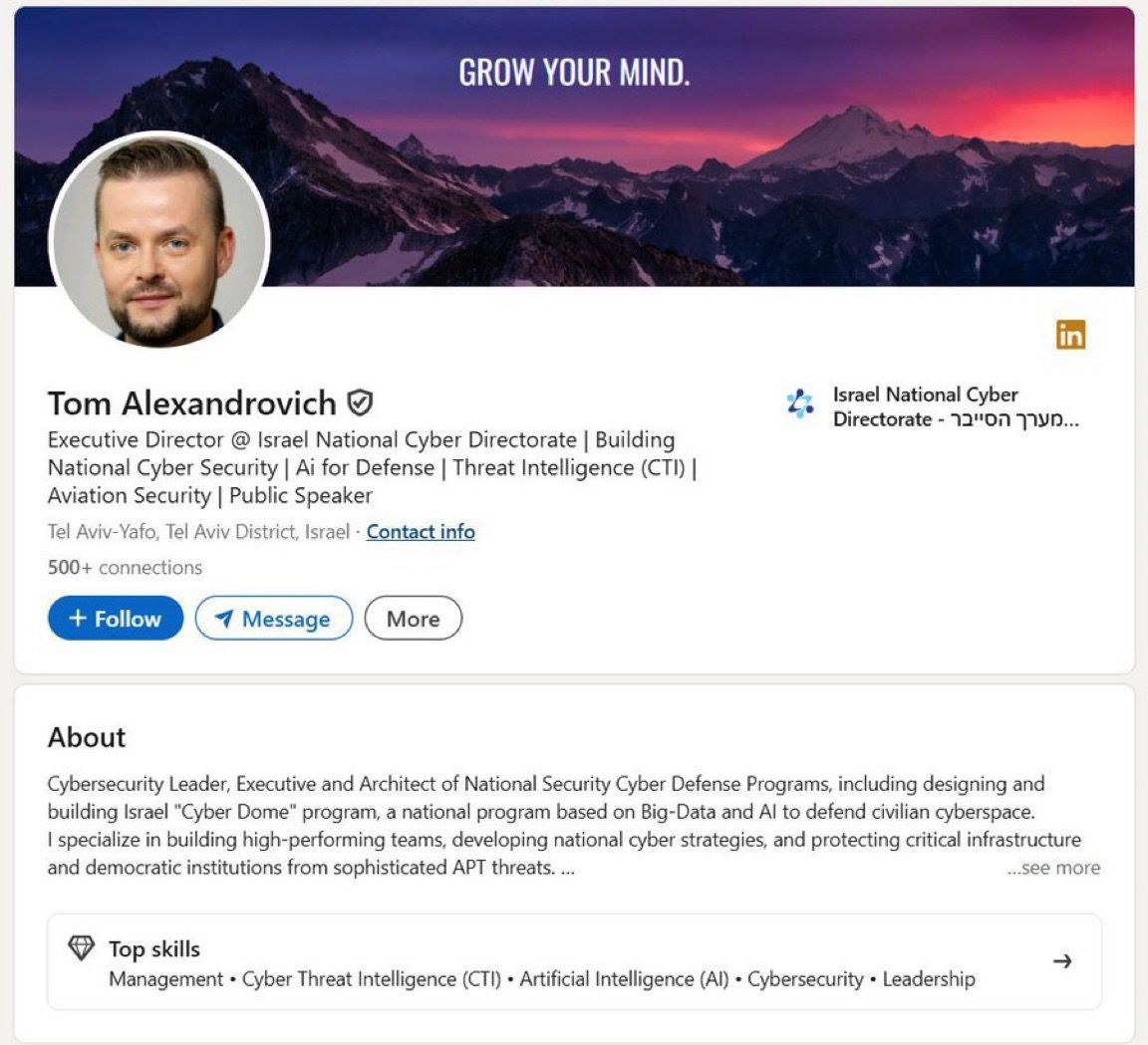 On August 15, 2025, the Las Vegas Metropolitan Police Department (LVPD) announced the arrest of eight individuals accused of being child sex predators during an undercover operation. Of those individuals, one was Tom Artiom Alexandrovich (age 38). LVPD's press release did not go into additional detail about this person. Shortly after, many news article were published alleging that this individual was the Executive Director as the Israel National Cyber Directorate. Alexandrovich's LinkedIn page (now deleted, screenshot below) appears to confirm his employment. Those arrested, including Alexandrovich, "face felony charges of Luring a Child with Computer for Sex Act" according to the LVPD. Per news articles, he was in town to attend the annual Black Hat Briefings when he was arrested.